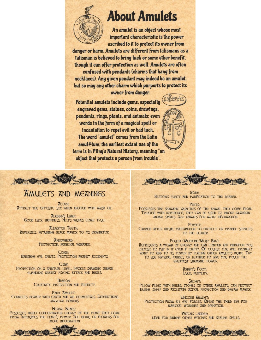Set Of 3 Book Of Shadows Pages About Amulets And Their Meanings Wicca Witchcraft Gold